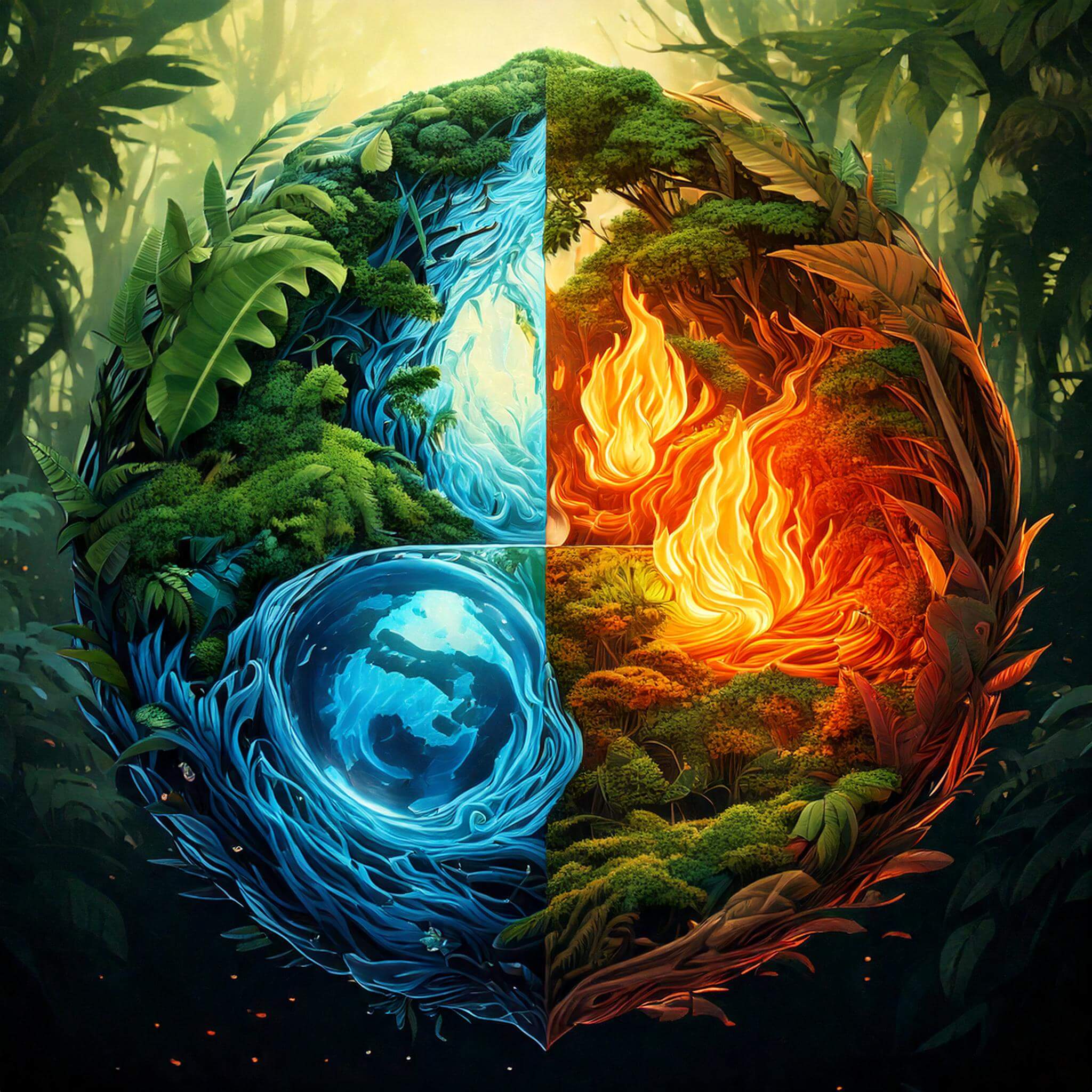 Y de la explosión surge la pausa, y en la pausa surge la naturaleza. Un mundo cubierto de naturaleza que se combina y transforma. Tierra y agua. Aire y fuego. Elementos químicos nacen. Se crea el sistema biológico y con él otros sistemas que permiten manifestar la vida en sí misma.